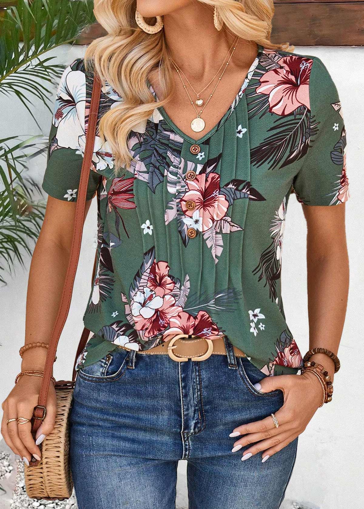 SALE Random Floral Print Tuck Stitch Green T Shirt Rosewe®