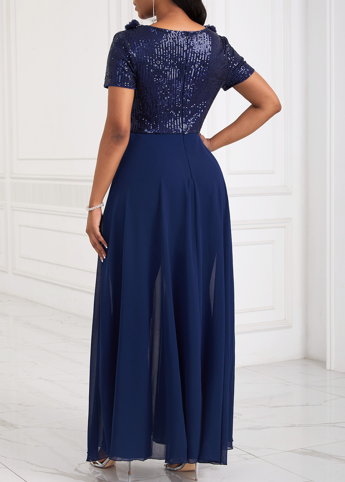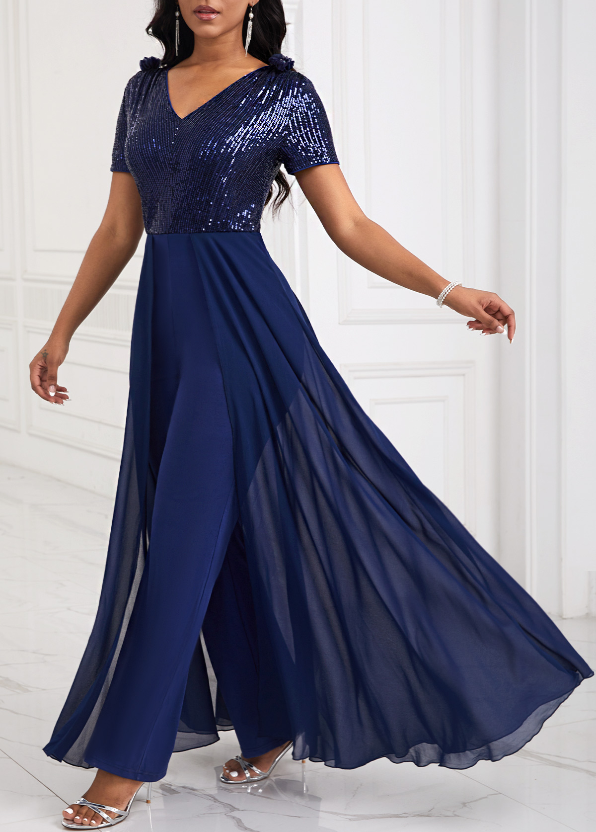 Sequin Long V Neck Short Sleeve Navy Jumpsuit Rosewe®