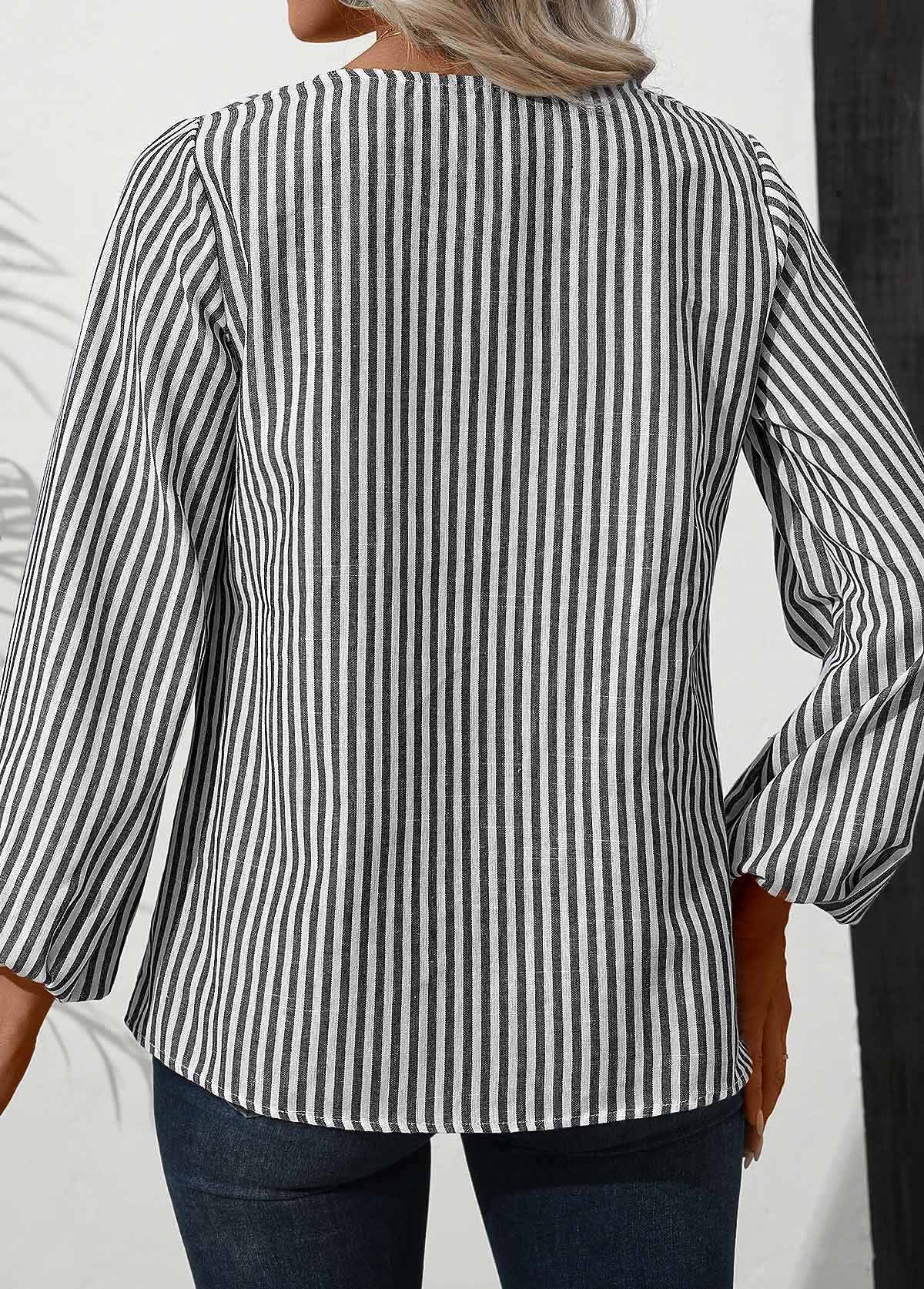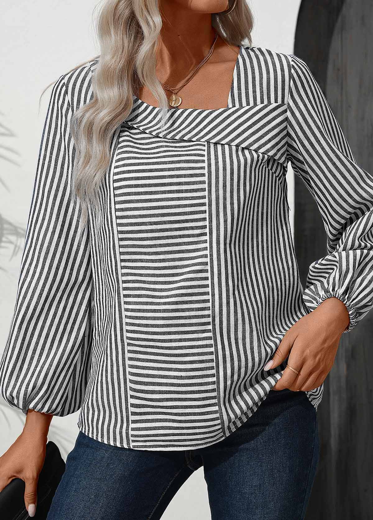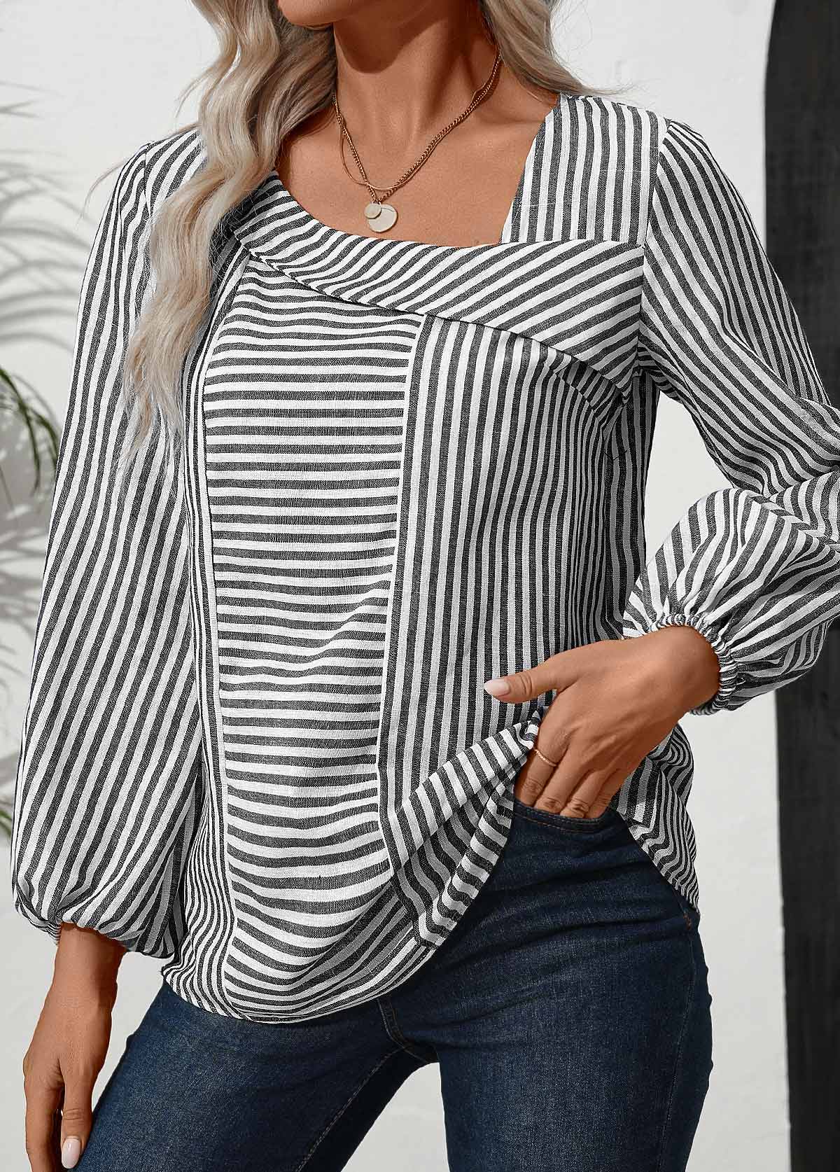 SALE Striped Asymmetry Navy Long Sleeve Asymmetrical Neck Blouse Rosewe®