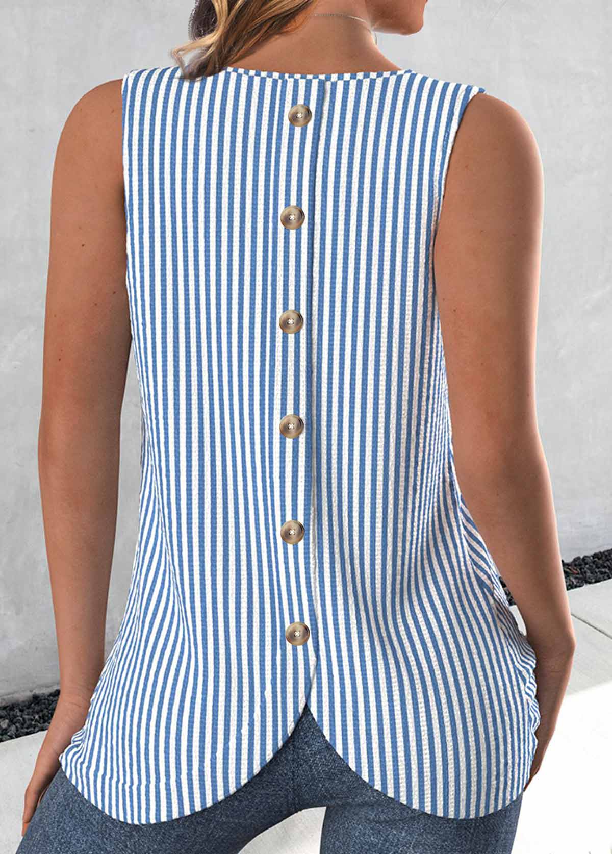 • Striped Button Blue Sleeveless Round Neck Tank Top