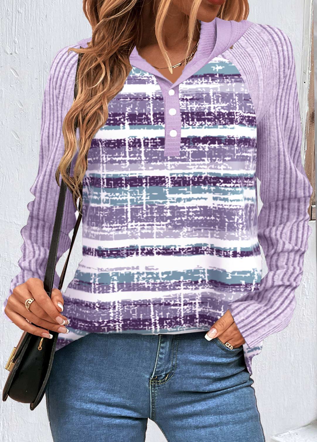 • Striped Button Light Purple Hooded Long Sleeve Sweatshirt