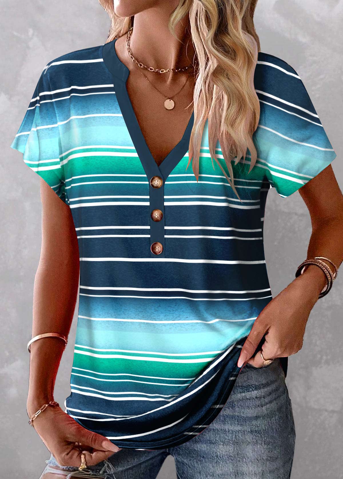SALE Striped Button Peacock Blue V Neck T Shirt Rosewe®