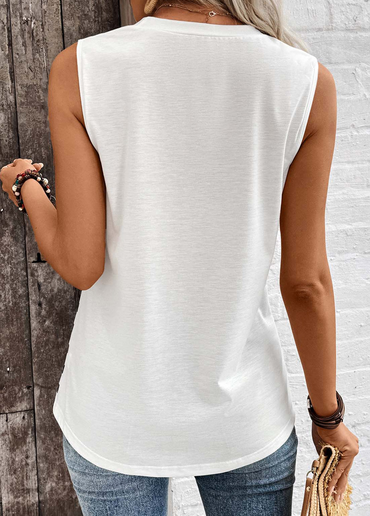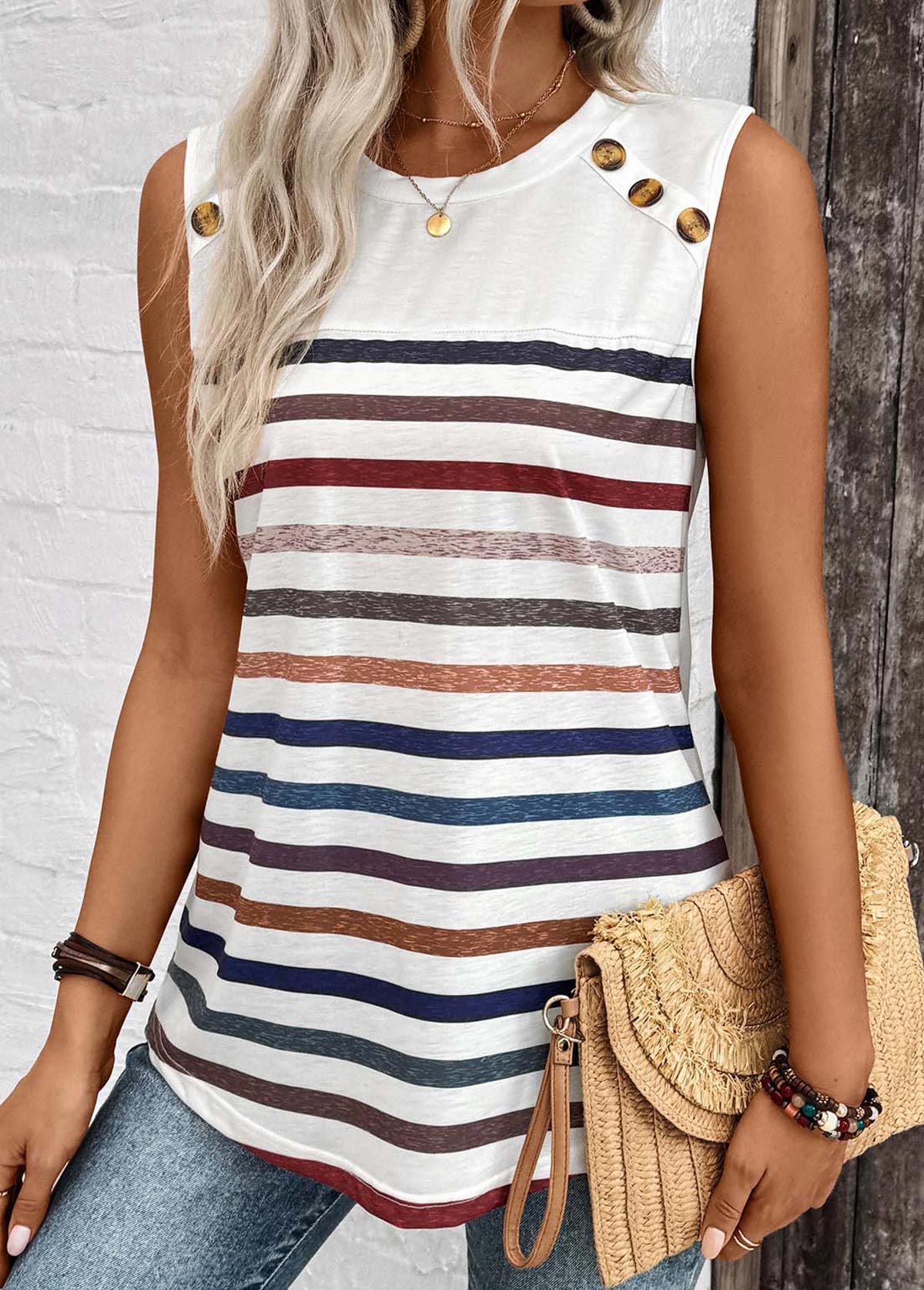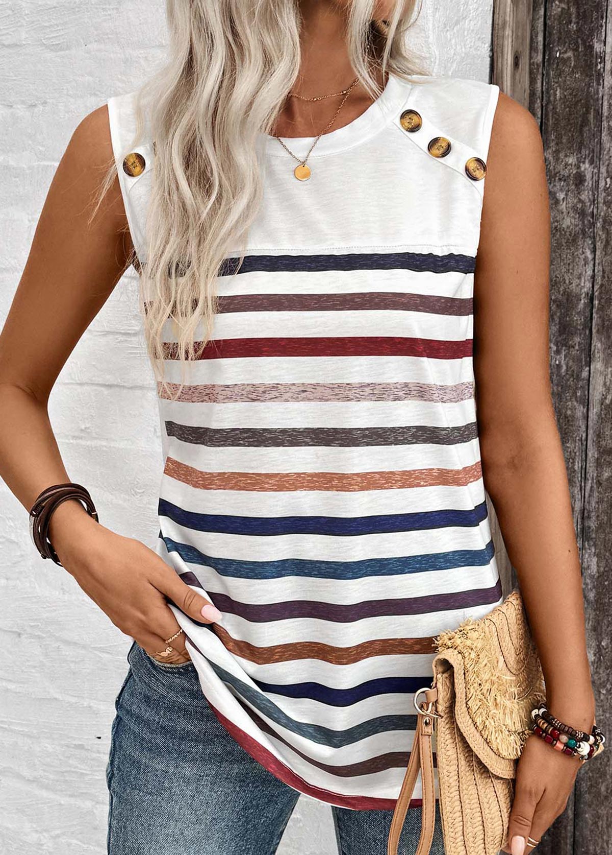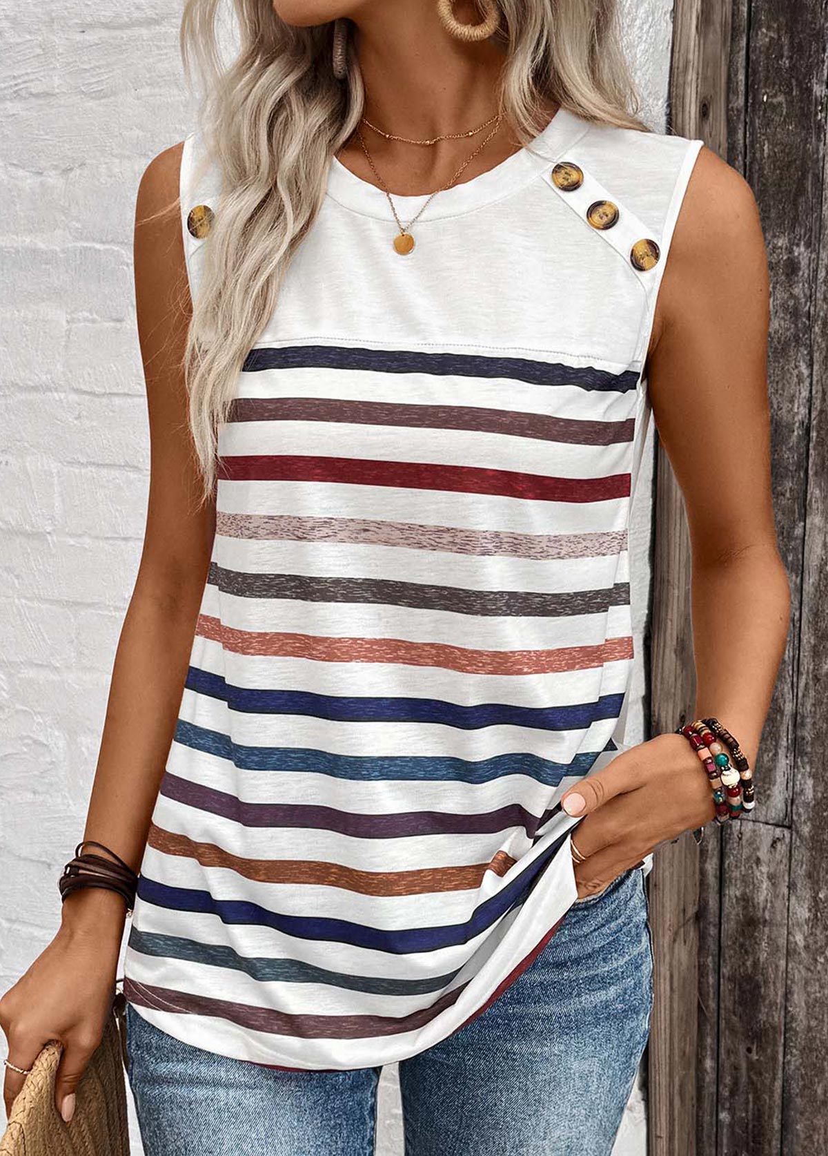 SALE Striped Button White Round Neck Tank Top Rosewe®