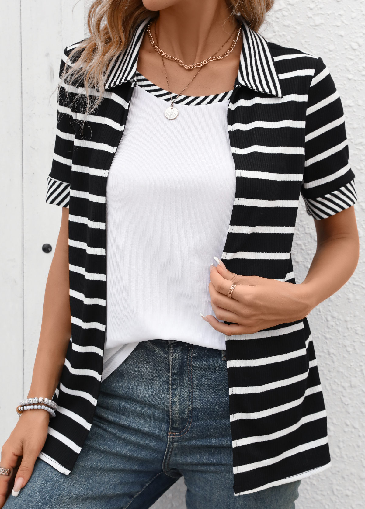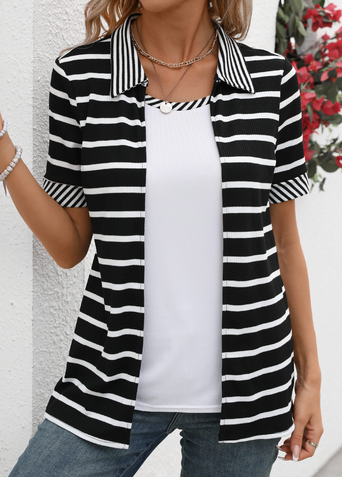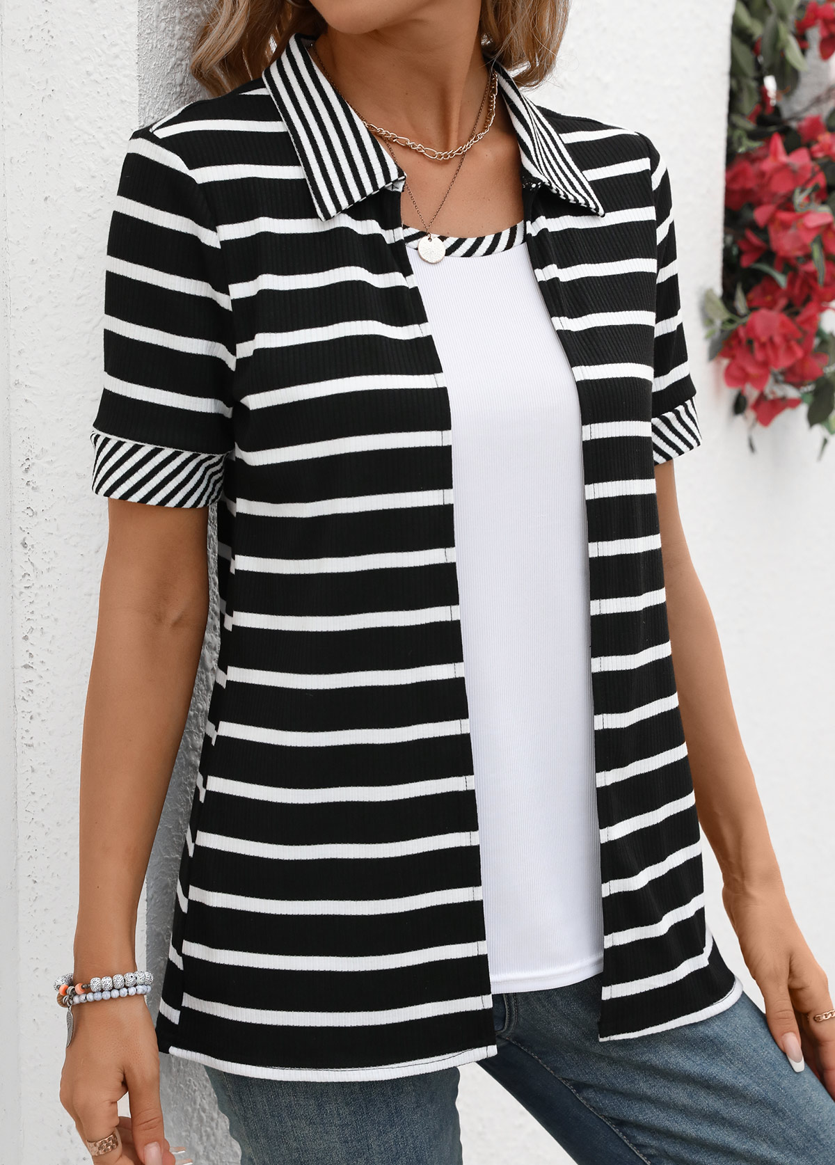 SALE Striped Fake 2in1 Black Short Sleeve T Shirt Rosewe®