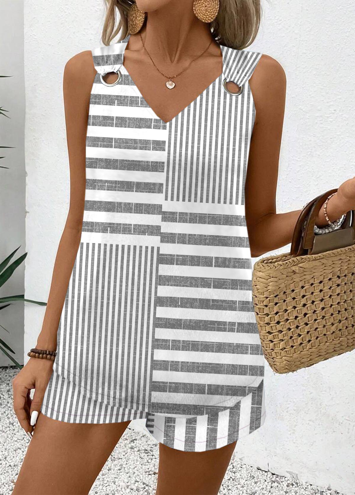 Striped Grey Sleeveless V Neck Tank Top and Shorts Rosewe®