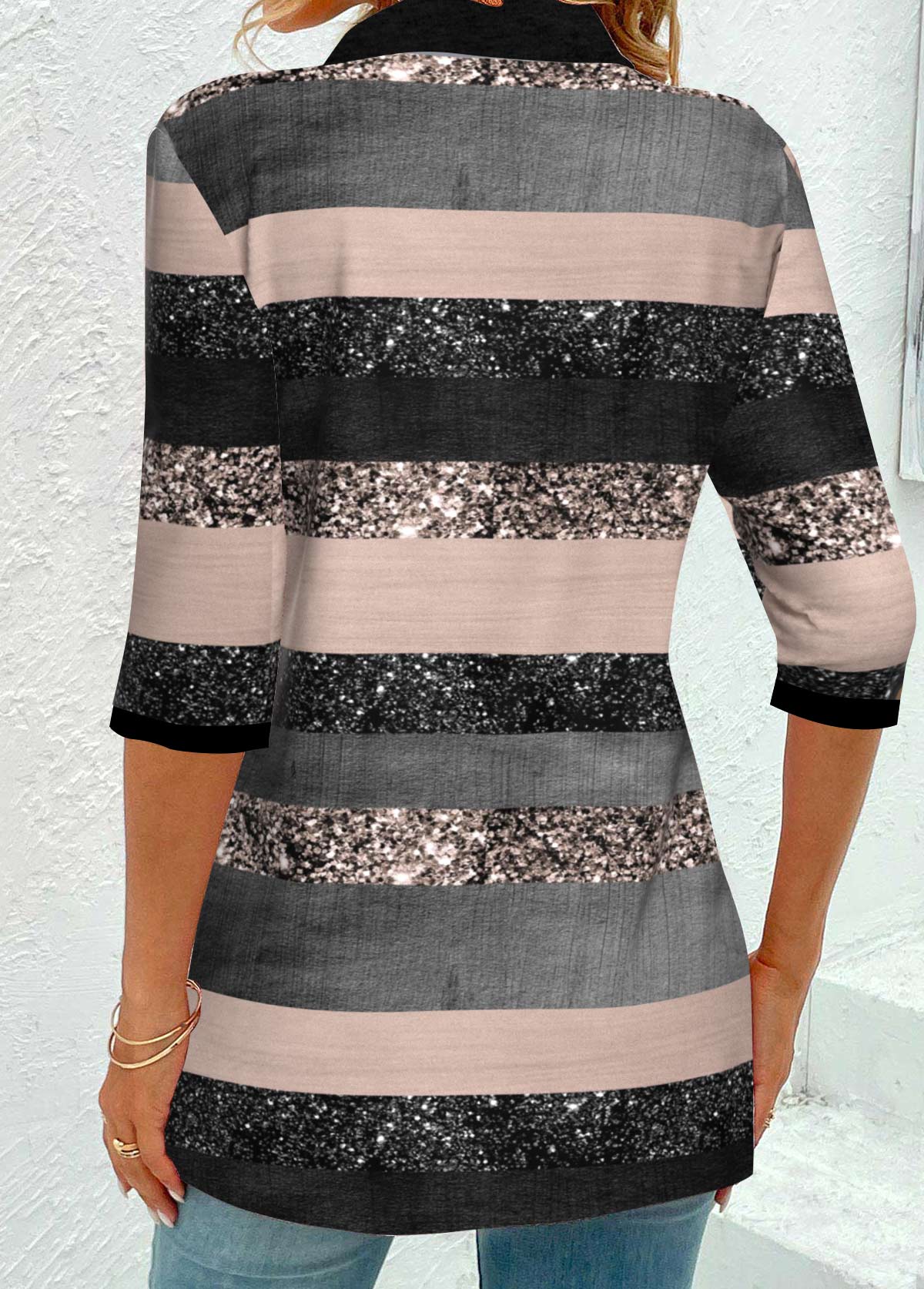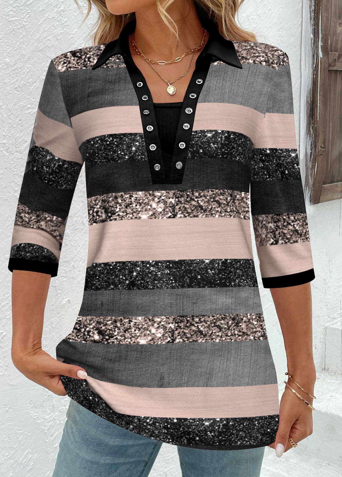 • Striped Grommet Multi Color Half Sleeve Shirt Collar Blouse