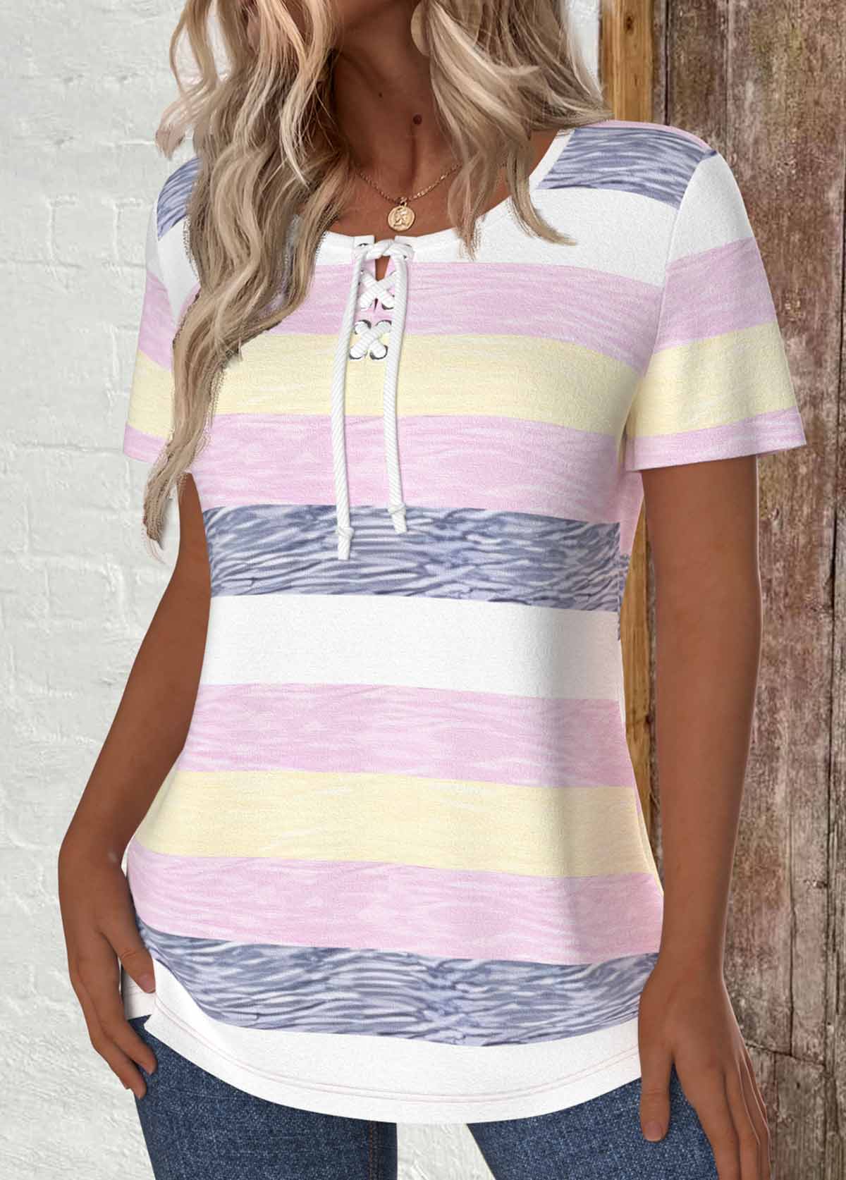 SALE Striped Lace Up Multi Color Short Sleeve T Shirt Rosewe®