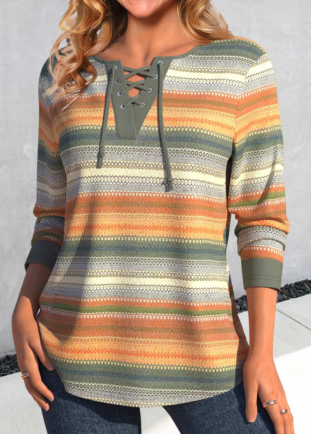 SALE Striped Lace Up Multi Color T Shirt Rosewe®