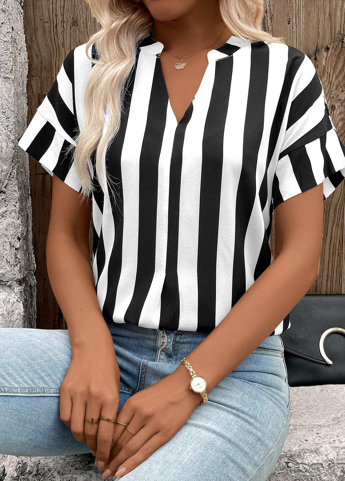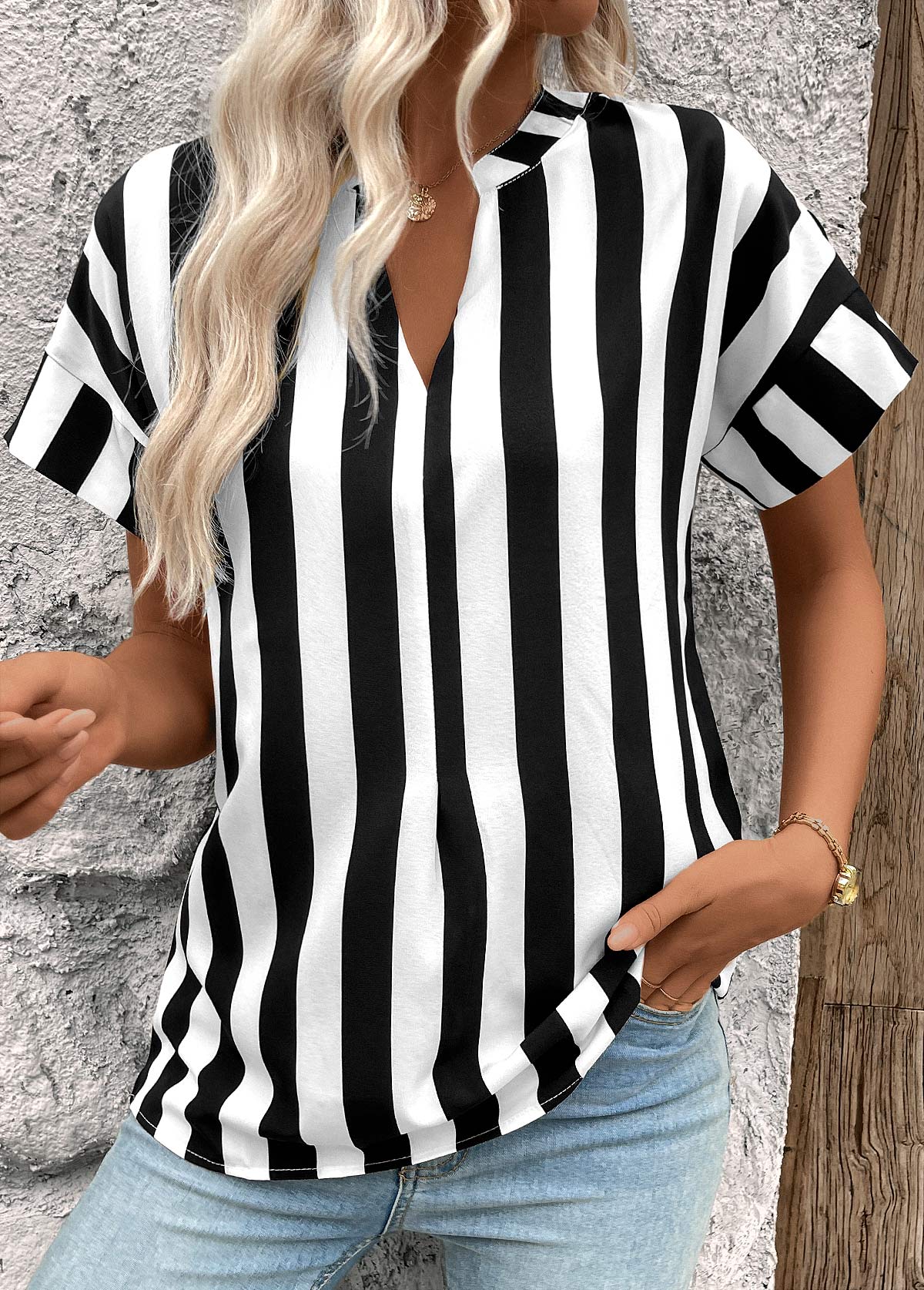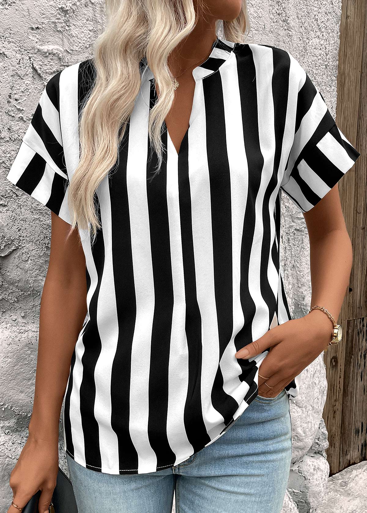 SALE Striped Patchwork Black Short Sleeve Split Neck Blouse Rosewe®