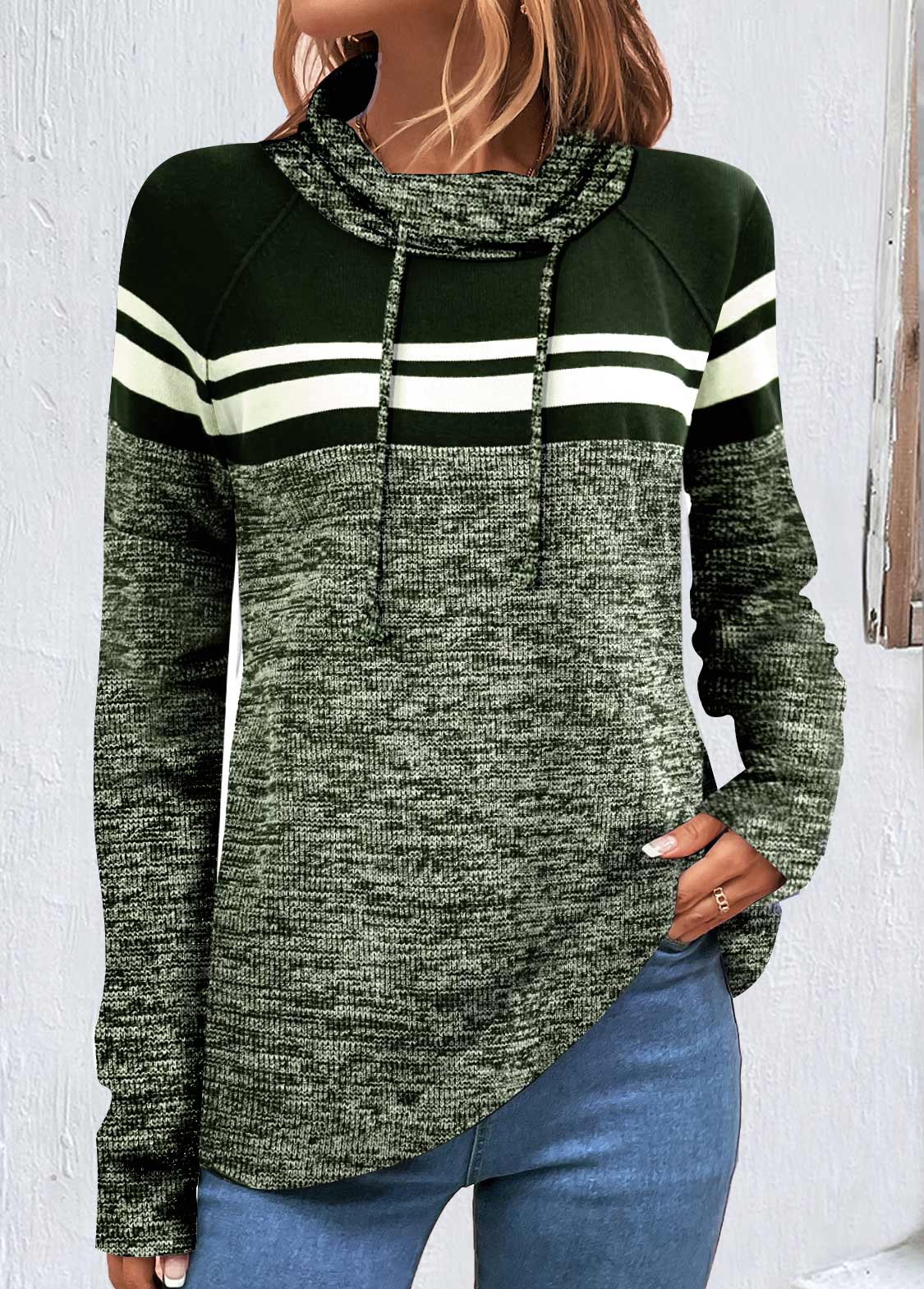 SALE Striped Patchwork Blackish Green Cowl Neck Long Sleeve Sweatshirt Rosewe®
