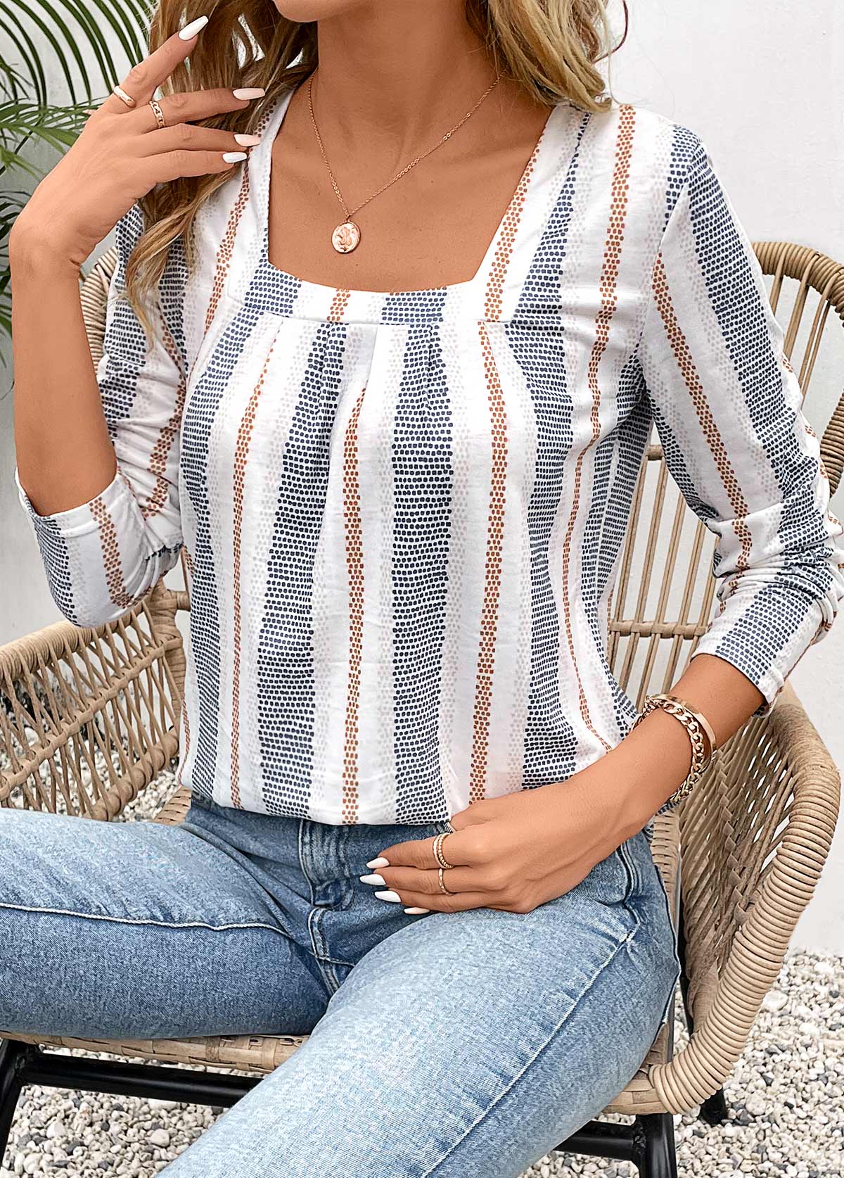 SALE Striped Patchwork Long Sleeve Square Neck T Shirt Rosewe®
