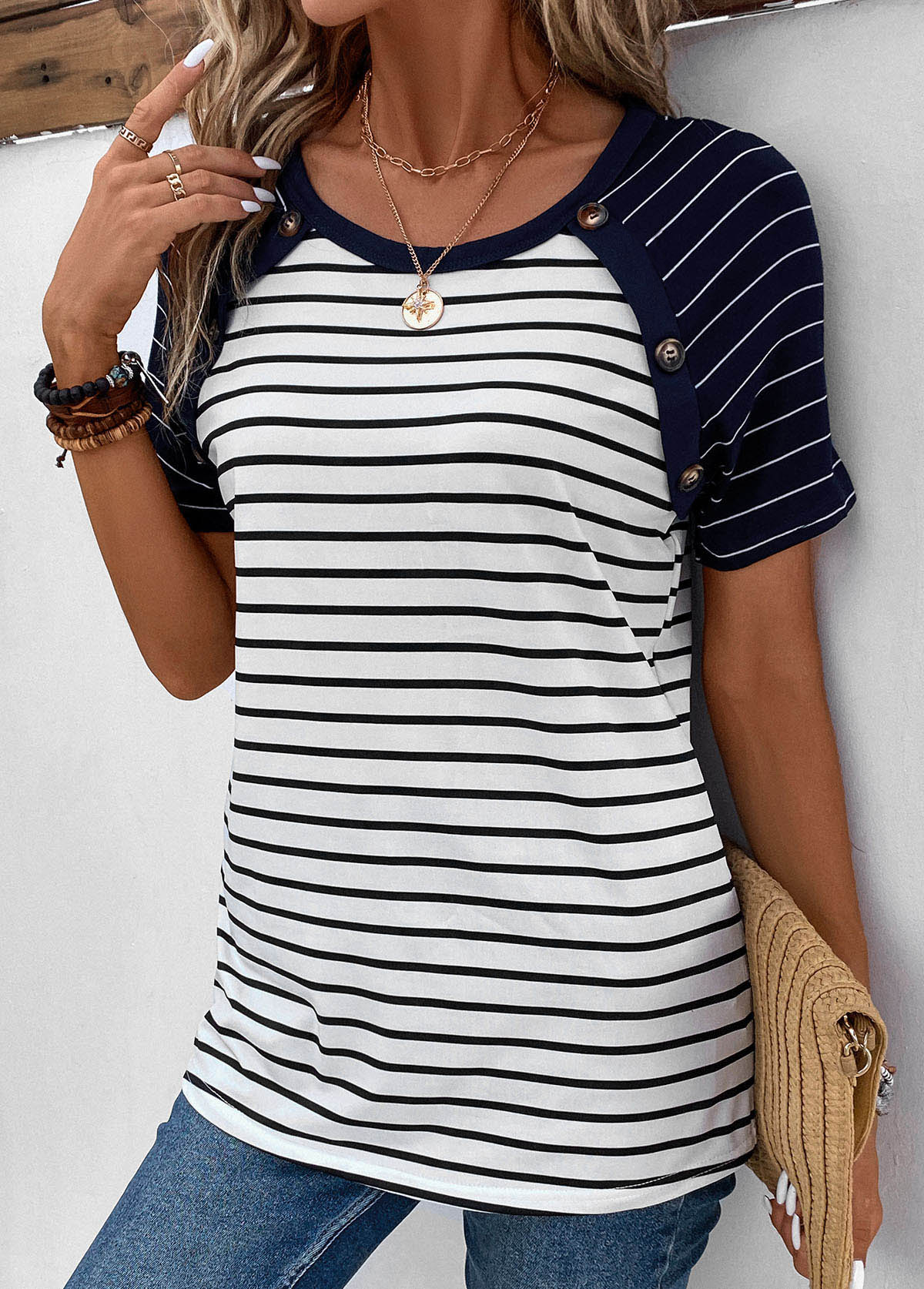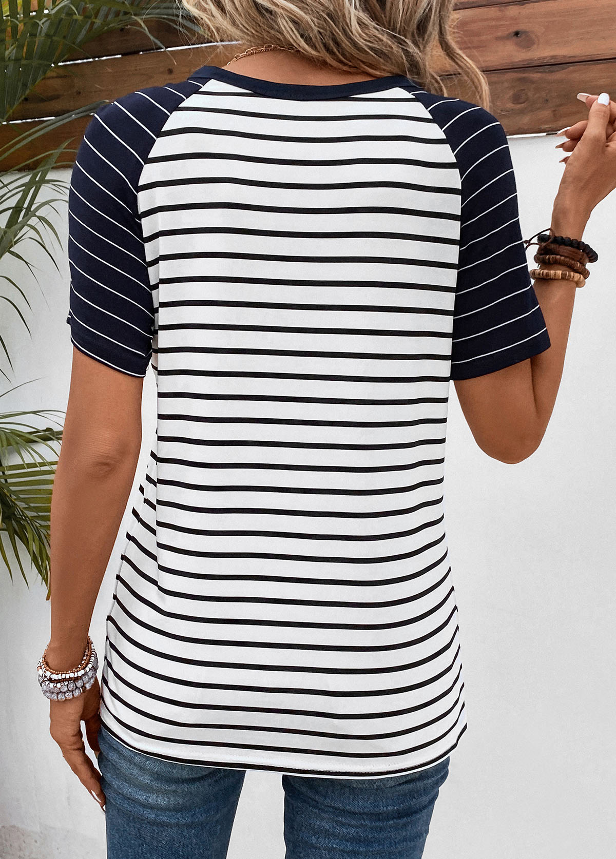 SALE Striped Patchwork Navy Round Neck T Shirt Rosewe®