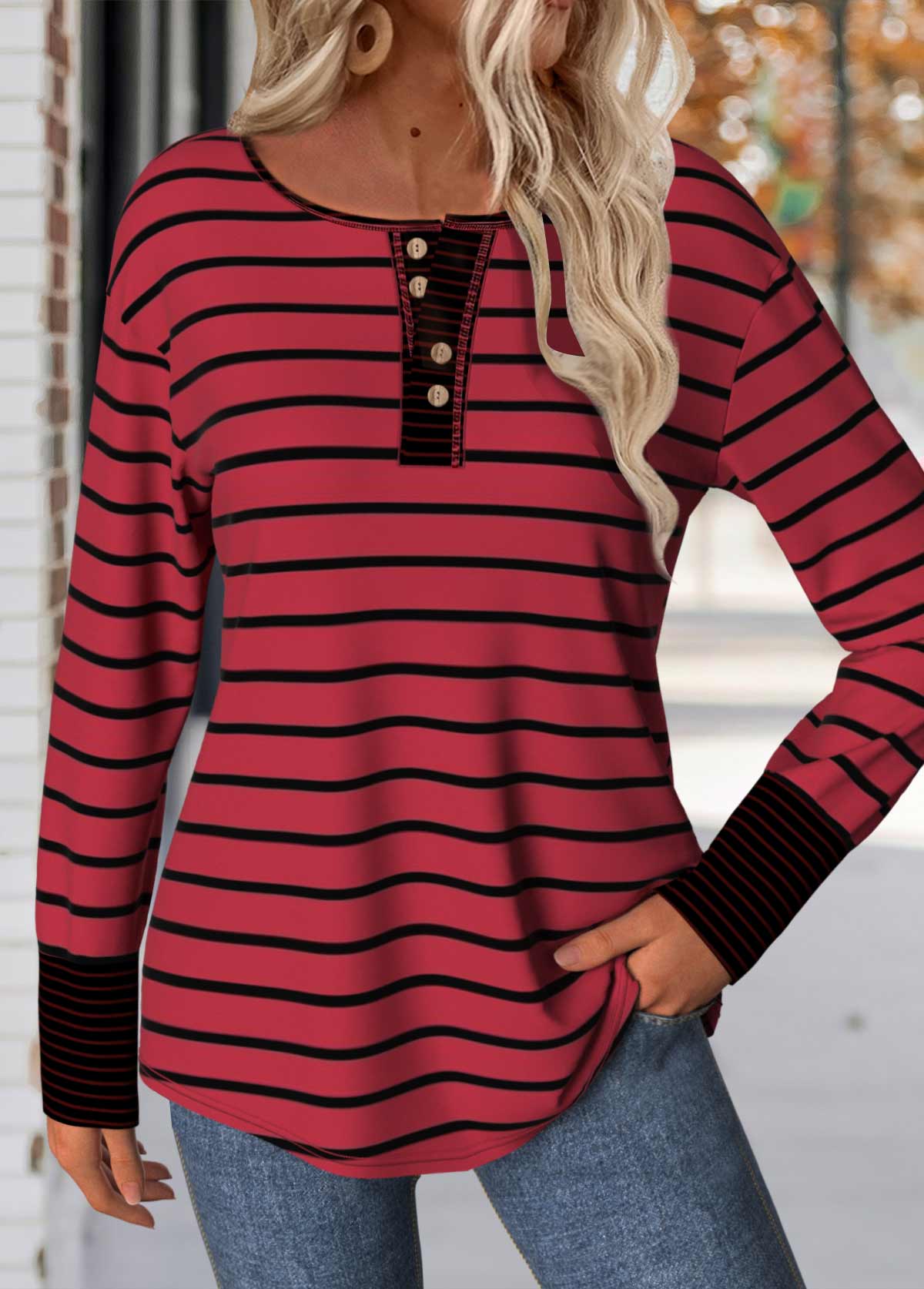 SALE Striped Patchwork Wine Red Long Sleeve T Shirt Rosewe®