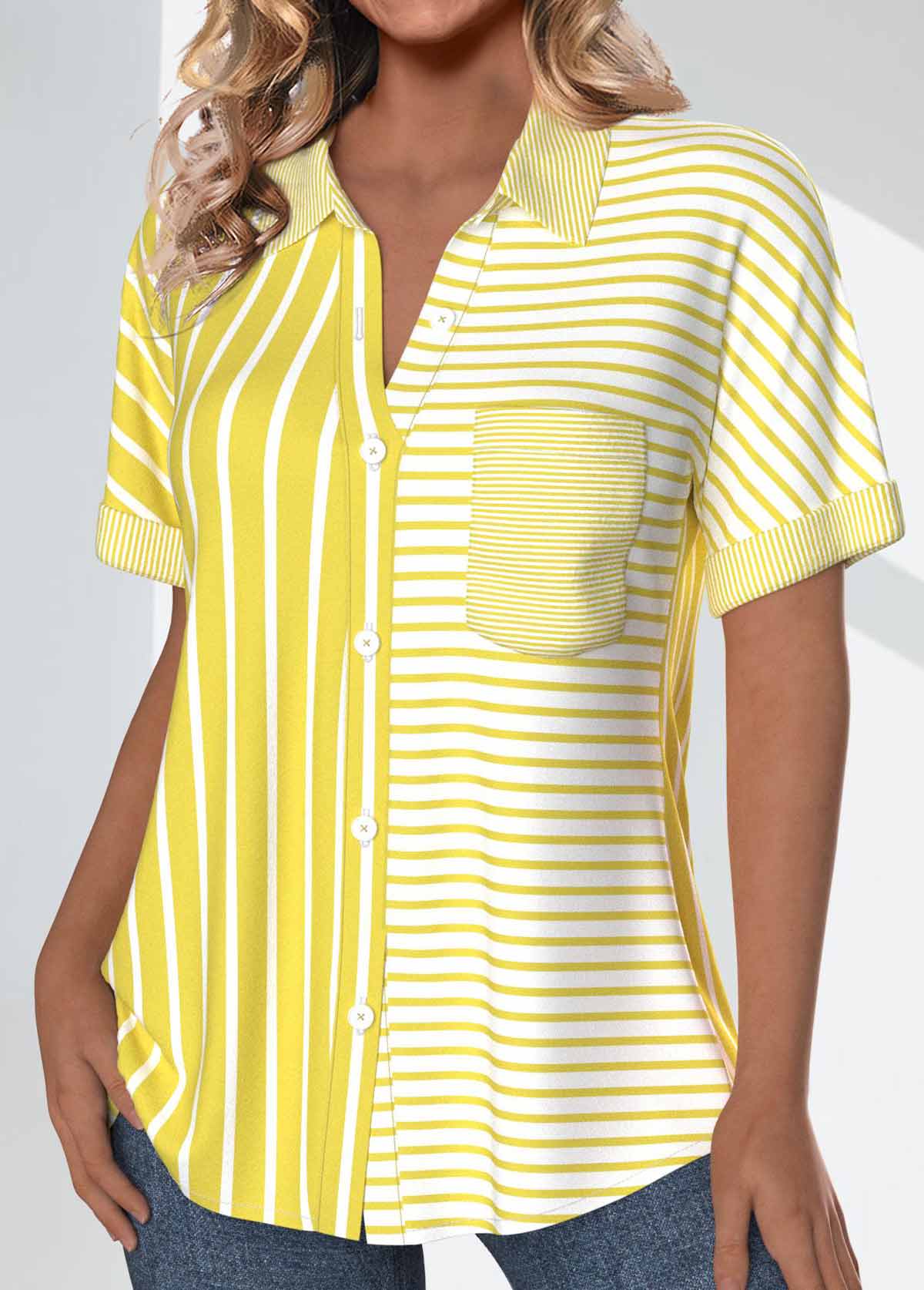 SALE Striped Pocket Light Yellow Short Sleeve Shirt Rosewe®