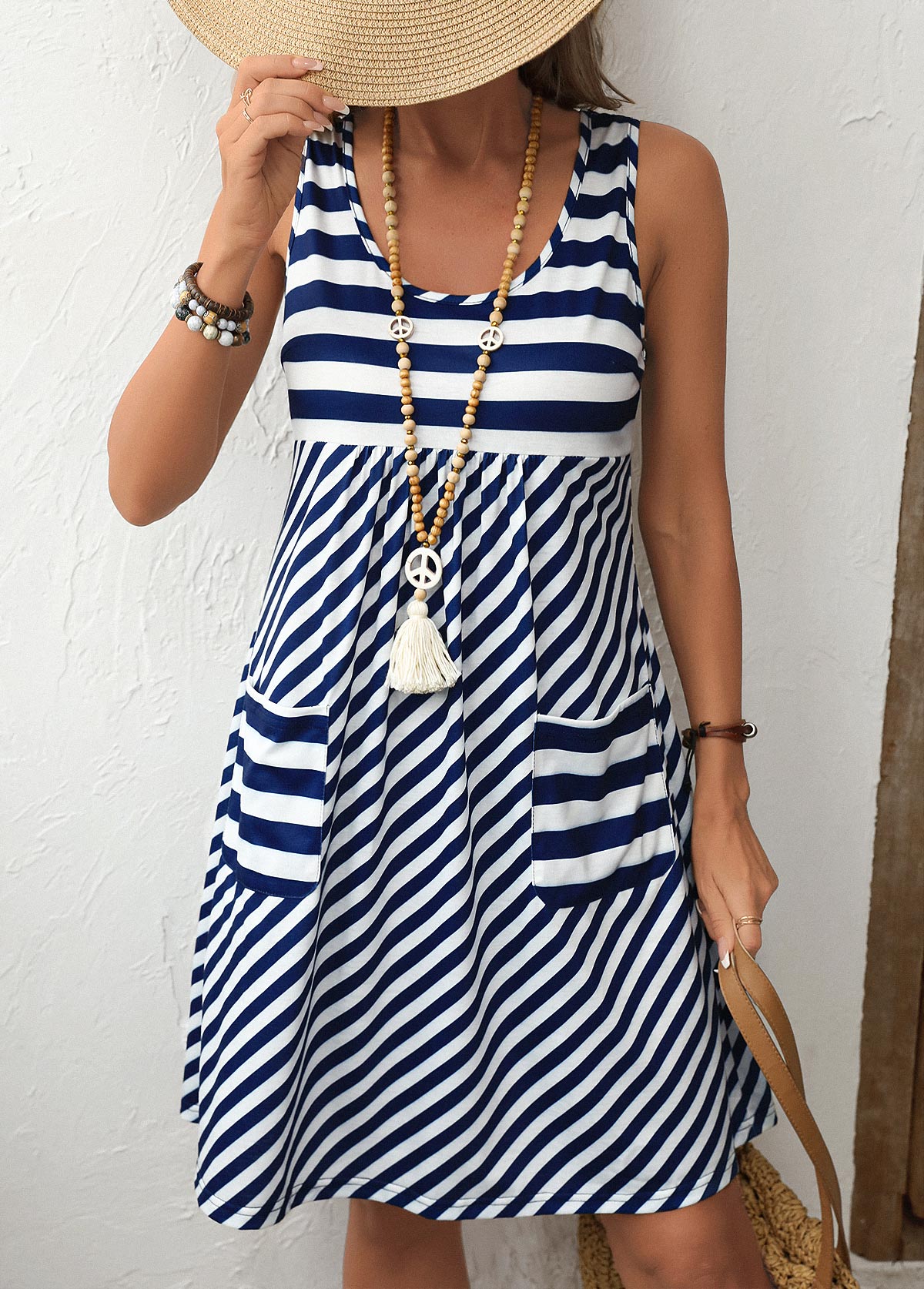 Striped Pocket Navy A Line Sleeveless Scoop Neck Dress Rosewe®