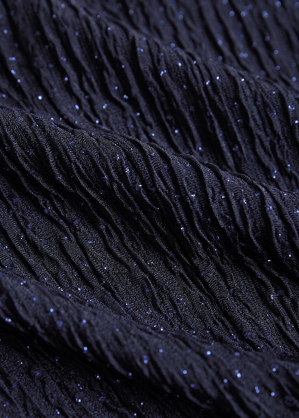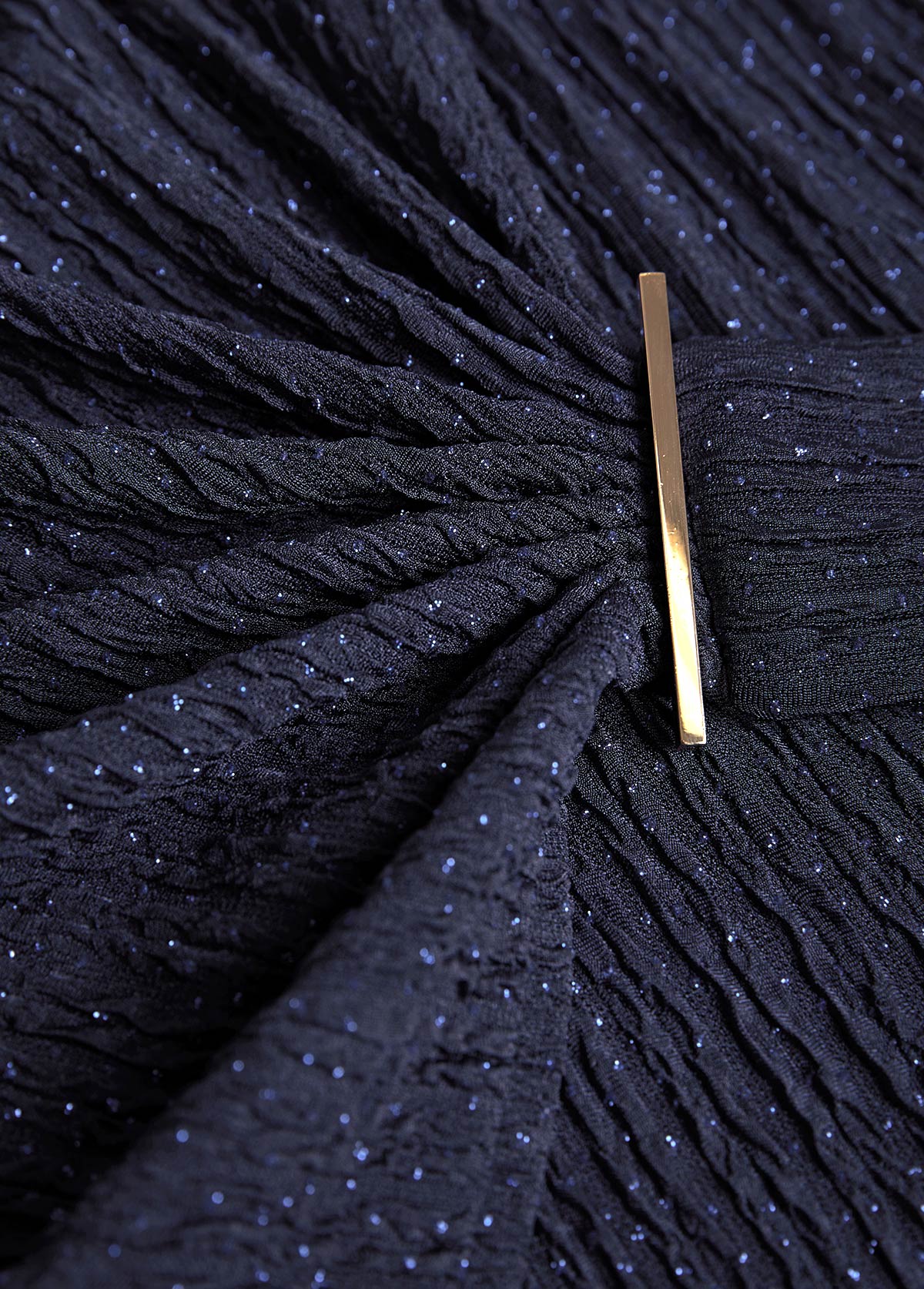 • Make a statement with this Navy shirt, designed with a chic V-neck and trendy roll-up sleeves. The eye-catching hot stamping detail adds a touch of glamour, while the surplice front elegantly drapes for a flattering fit. With its tunic length providing excellent tummy coverage, this relaxed style is perfect for everyday wear.