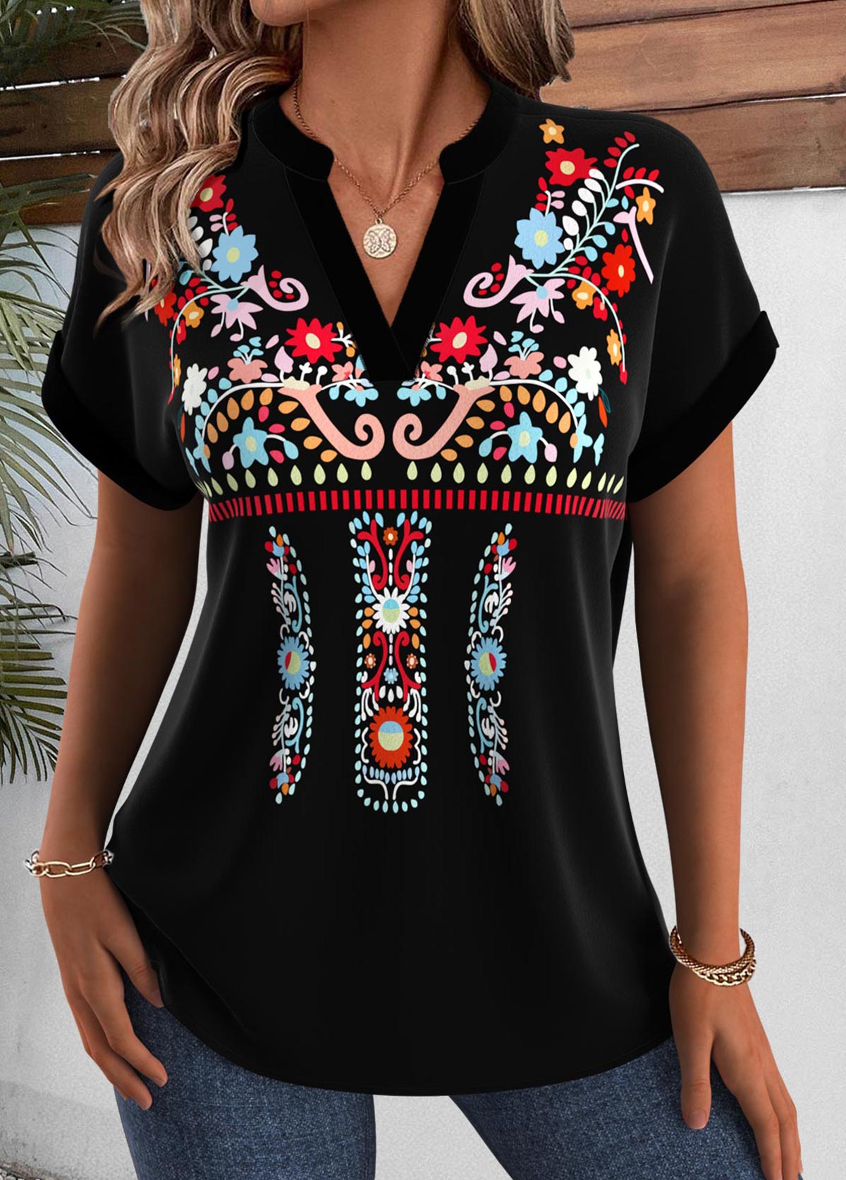SALE Tribal Print Black Short Sleeve Split Neck Blouse Rosewe®