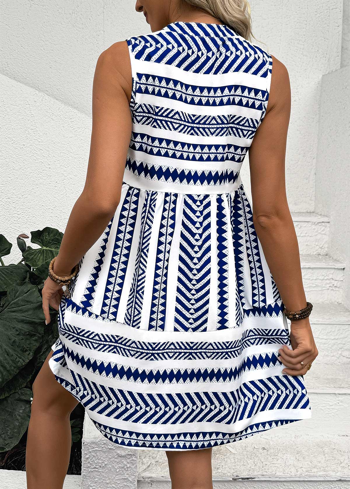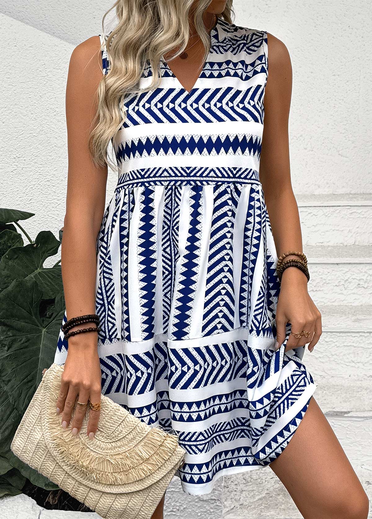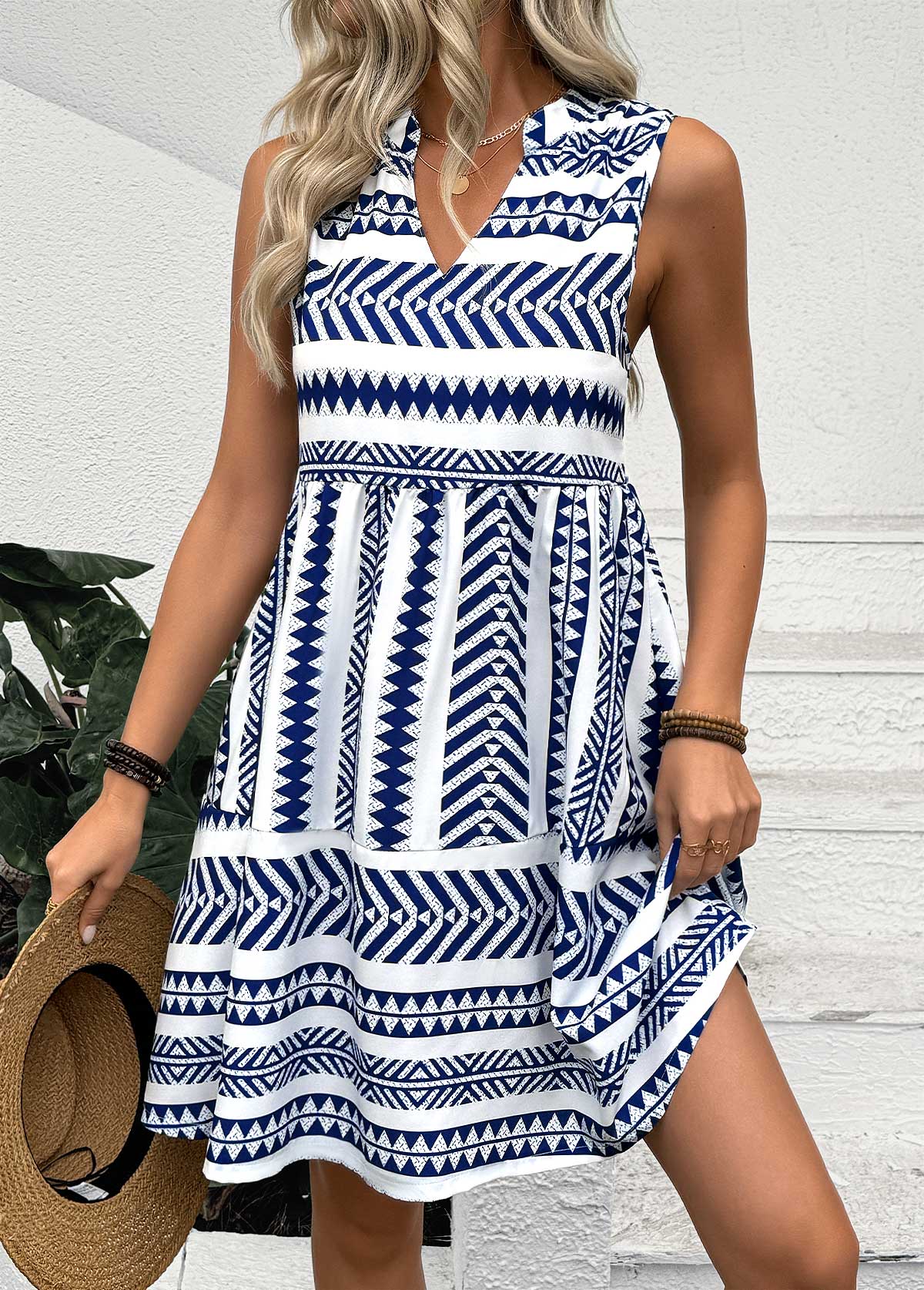 SALE Tribal Print Blue Sleeveless Split Neck Dress Rosewe®