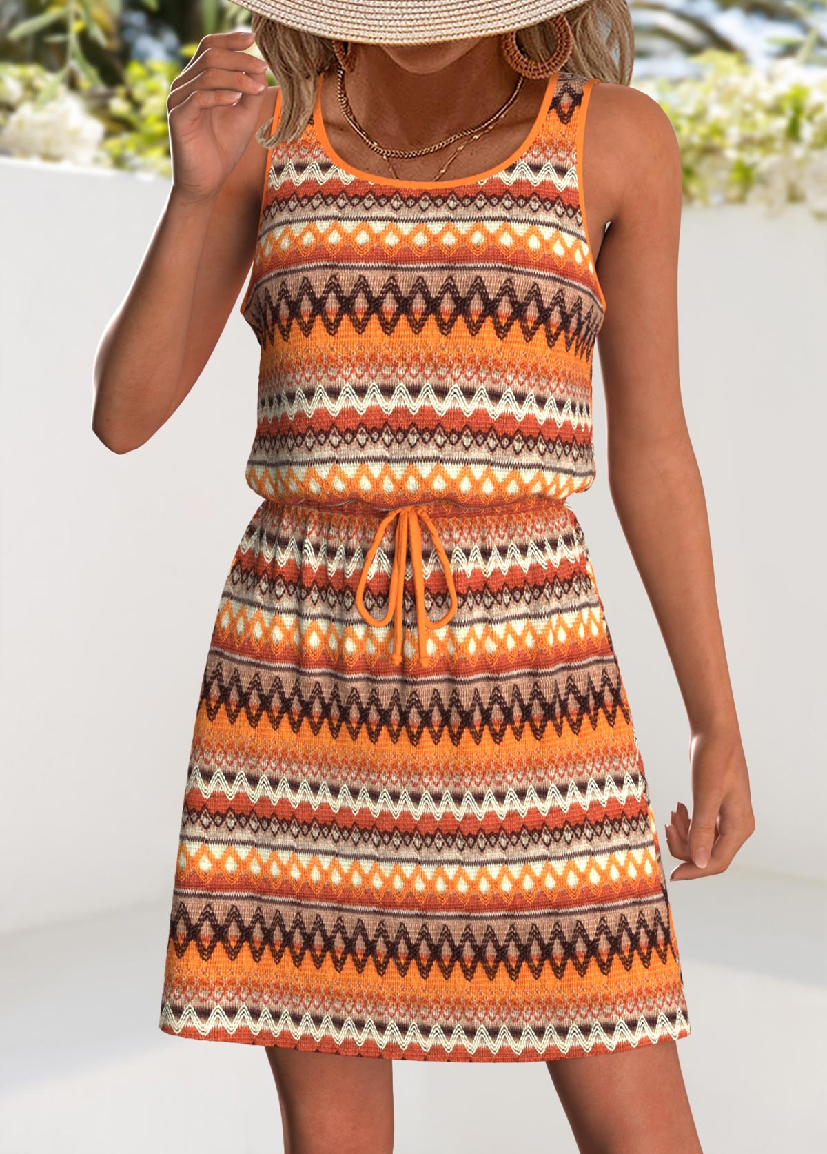 Tribal Print Drawstring Orange Short Sleeveless Scoop Neck Dress Rosewe®