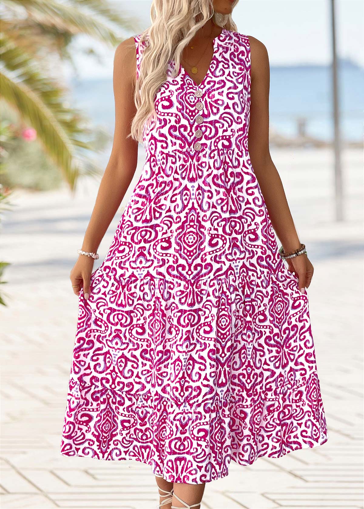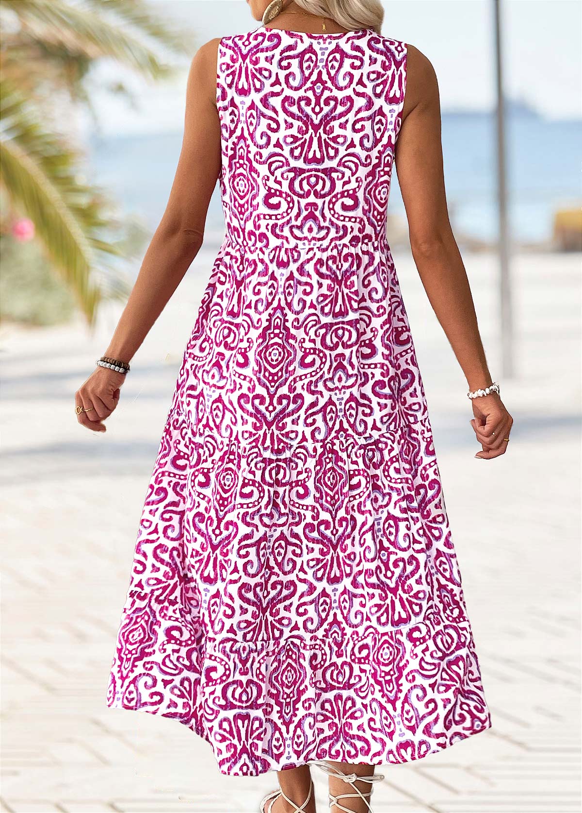 Tribal Print Hot Pink Maxi Sleeveless Split Neck Dress Rosewe®