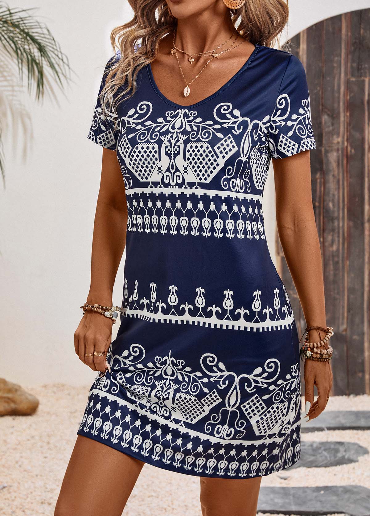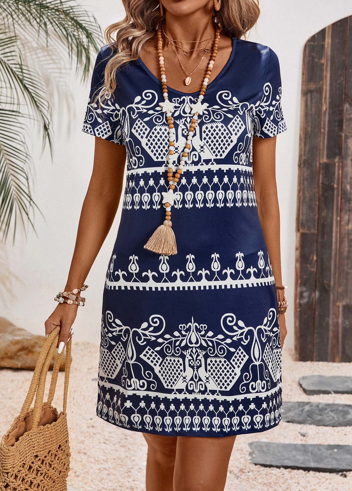 SALE Tribal Print Navy A Line Short Sleeve Dress Rosewe®