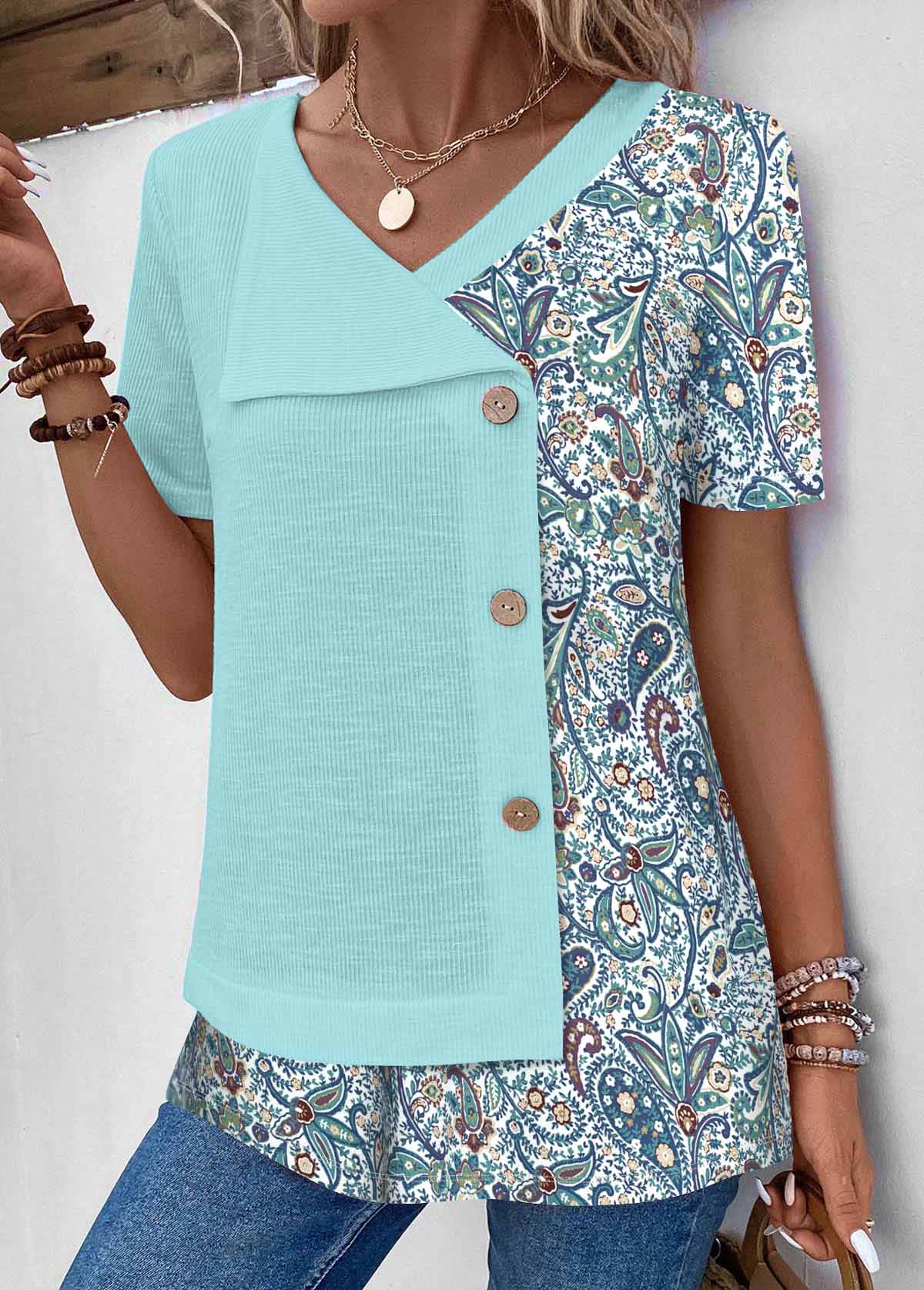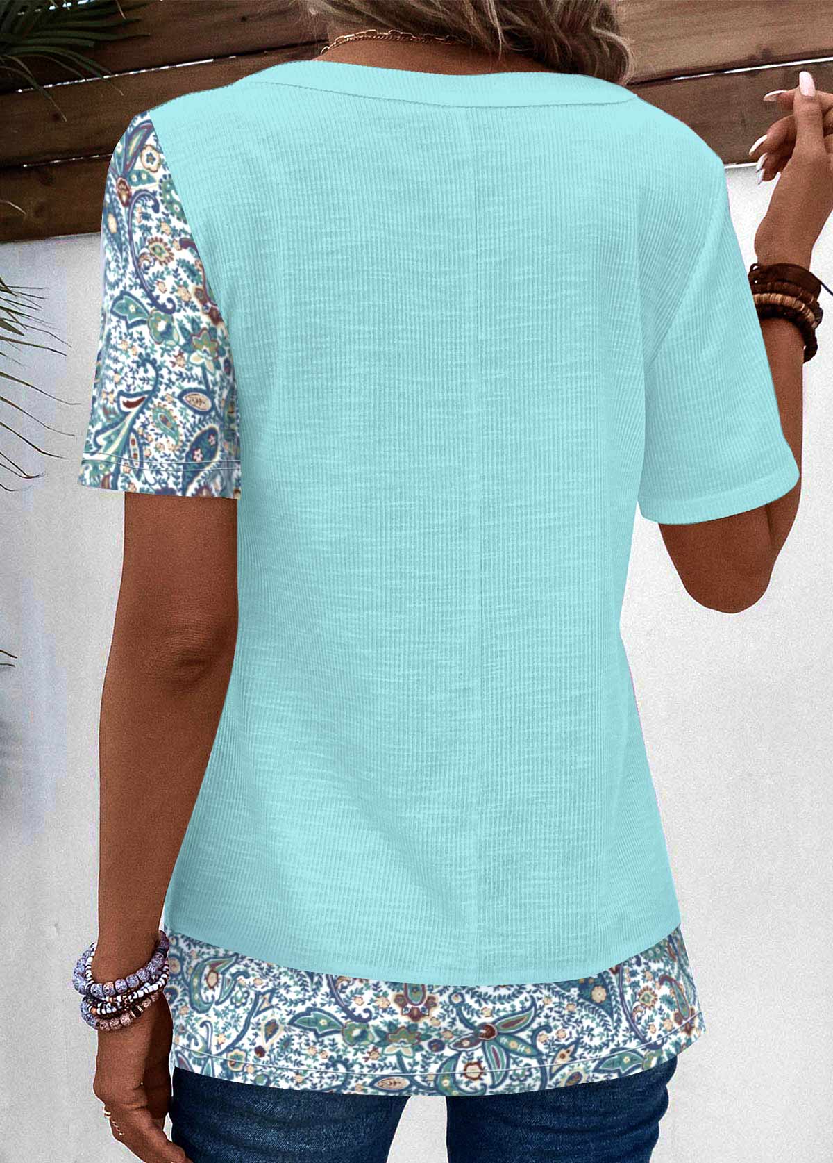 SALE Tribal Print Patchwork Light Blue Short Sleeve T Shirt Rosewe®