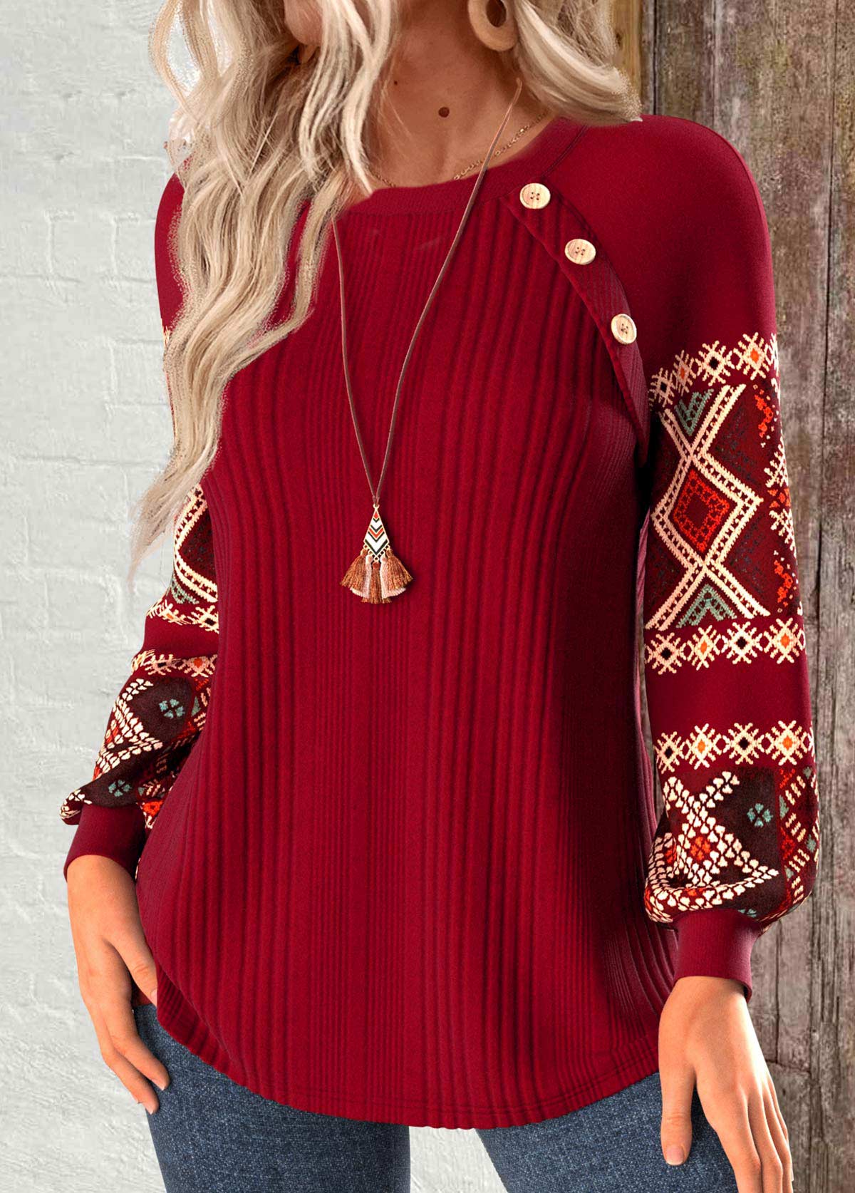 SALE Tribal Print Patchwork Wine Red Long Sleeve Sweatshirt Rosewe®