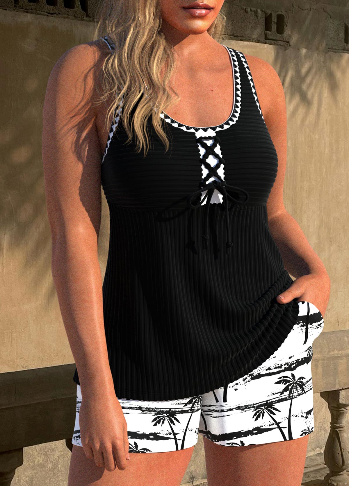 SALE Tropical Plants Print Lace Up Black Tankini Set Rosewe®