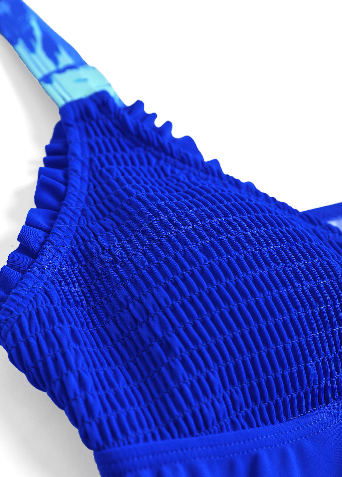 • Tropical Plants Print Smocked Royal Blue Tankini Set