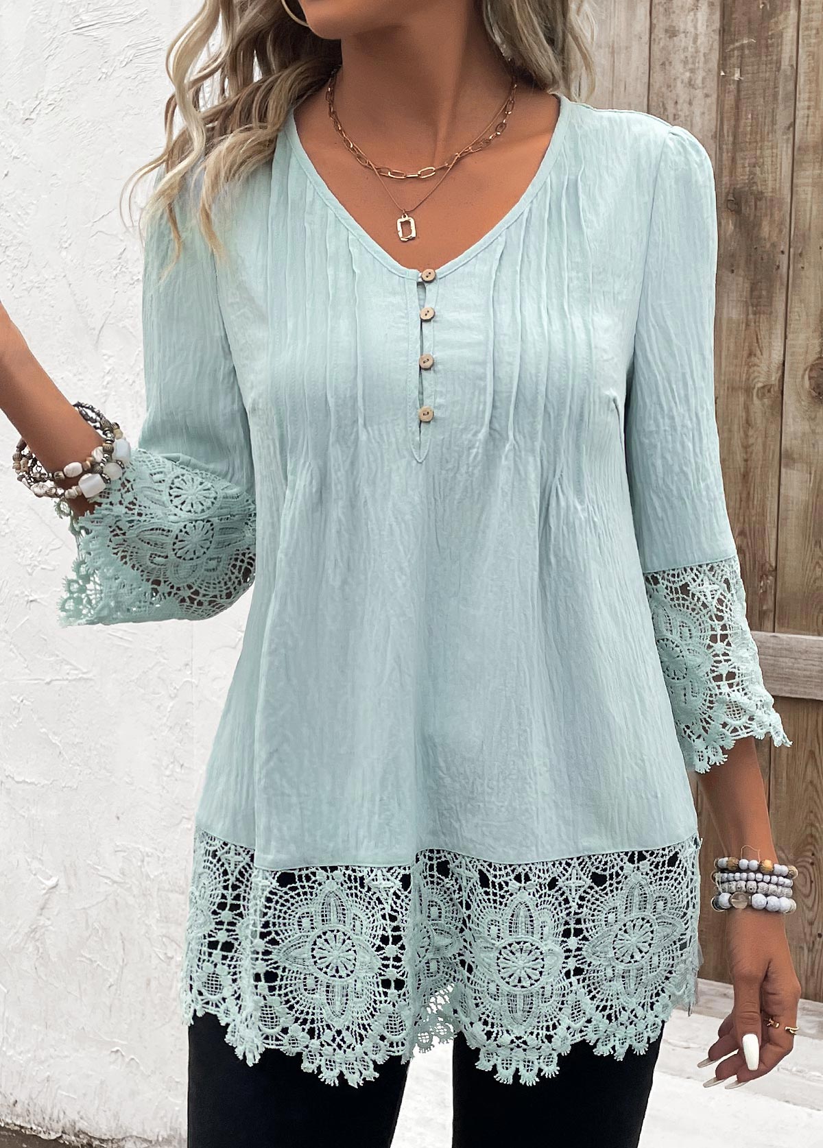 SALE Tuck Stitch Light Green 3/4 Sleeve V Neck Blouse Rosewe®