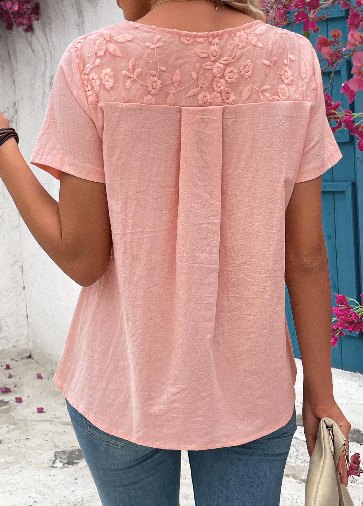 SALE Tuck Stitch Light Pink Short Sleeve Round Neck Blouse Rosewe®