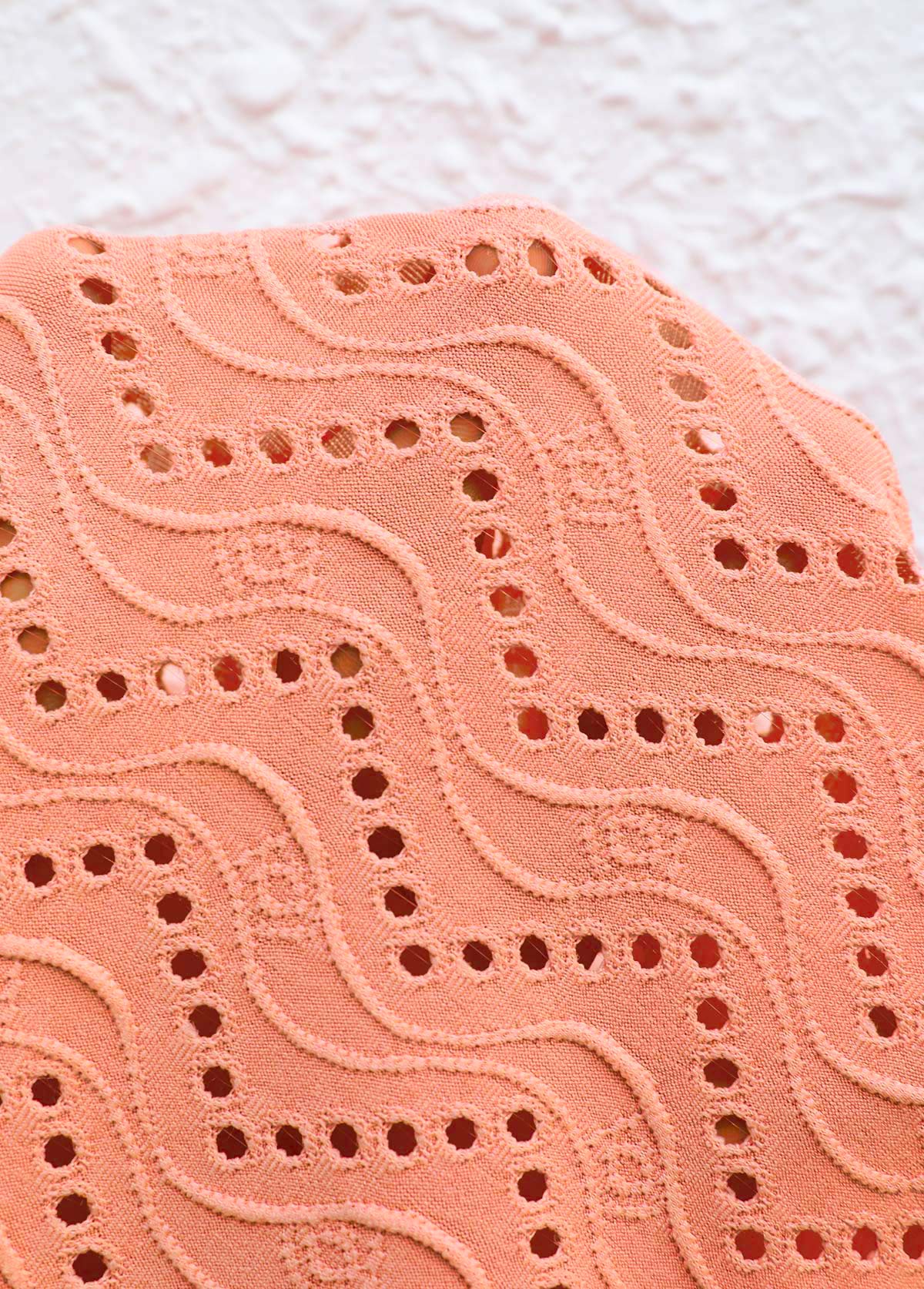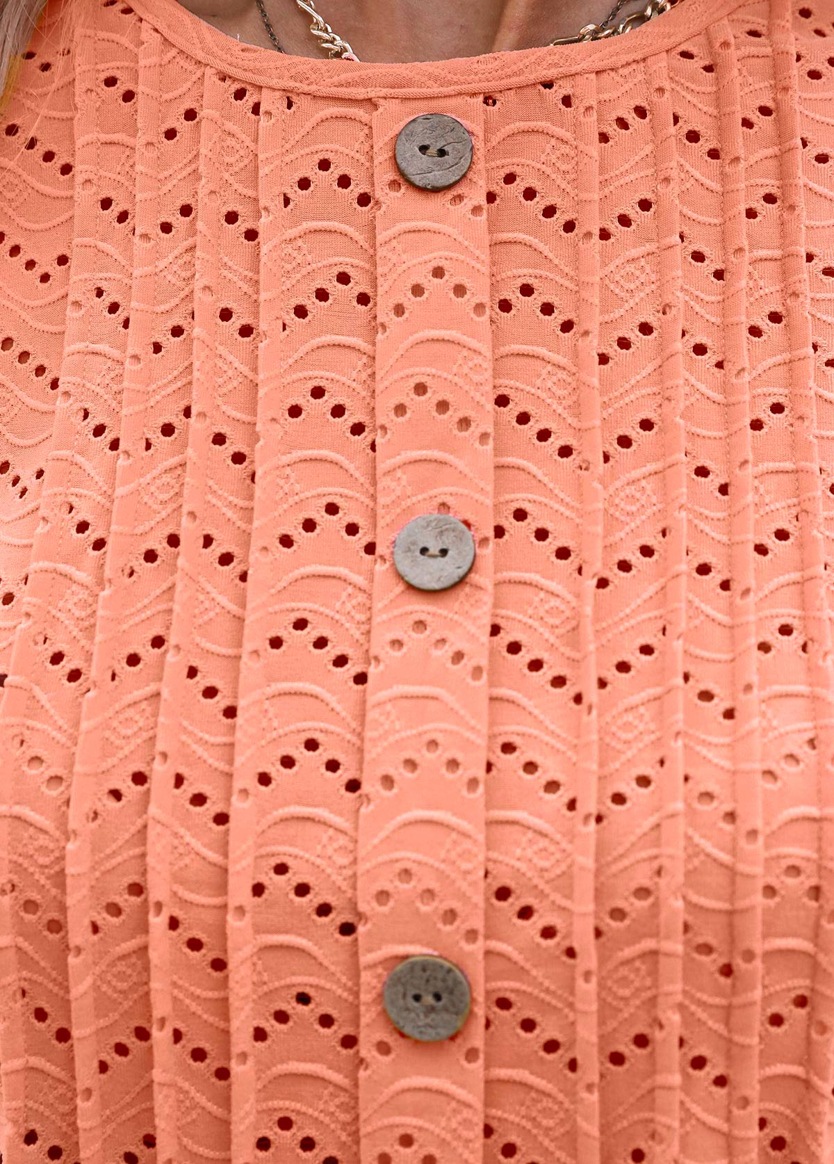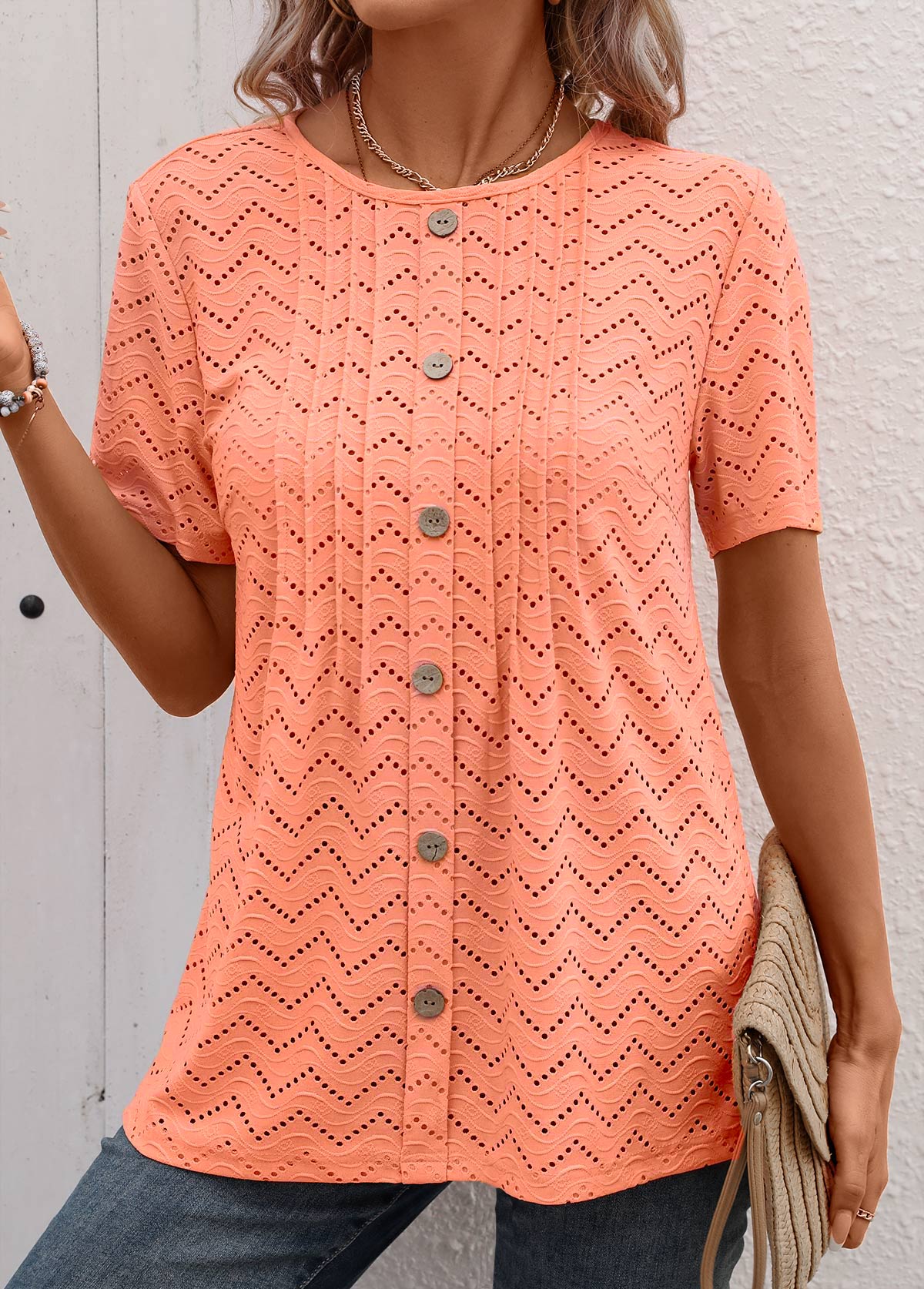 • It's a must-have for casual everyday wear, vibrant in orange hue, featuring a delightful tummy coverage function. Delicate tucks accentuate graceful contours, while the jacquard fabric offers a refreshing touch. Its unique button design exudes a sense of fashion, and the cleverly placed tiny perforations provide added breathability and comfort.