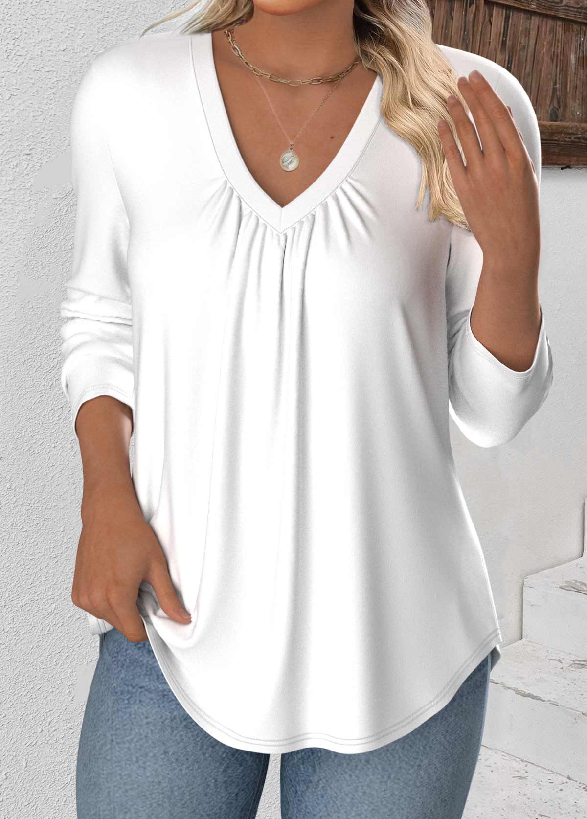 White Long Sleeve V Neck T Shirt Rosewe®